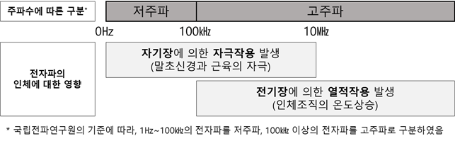 * 전자파는 전기장과 자기장의 파동으로, <그림 1>과 같이 주파수에 따라 고주파와 저주파로 구분할 수 있으며 특히 저주파에서는 전기장보다는 자기장이 인체에 영향을 주기 때문에, 차단 주파수범위 등은 소비자의 구매선택에 중요한 내용임